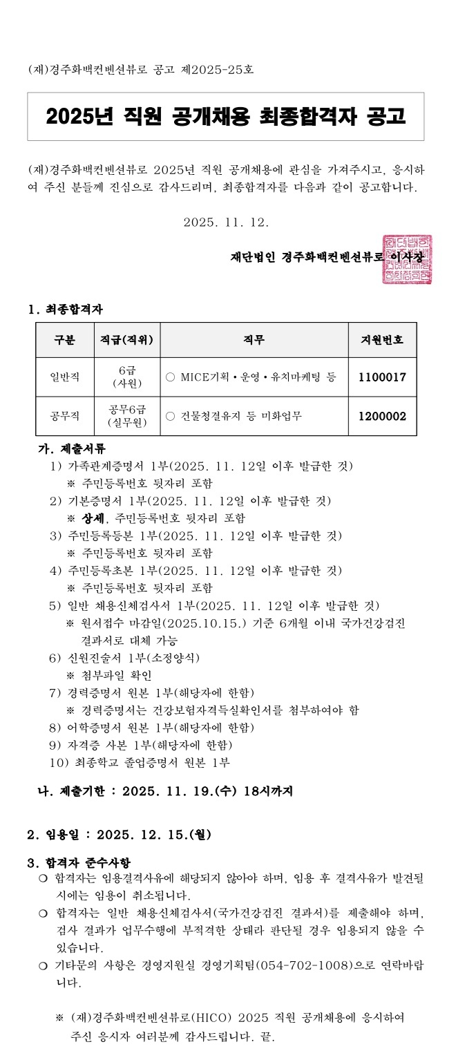 | 제목 | 2025년 직원 공개채용 최종합격자 공고 | 작성일 | 2025-11-12 |